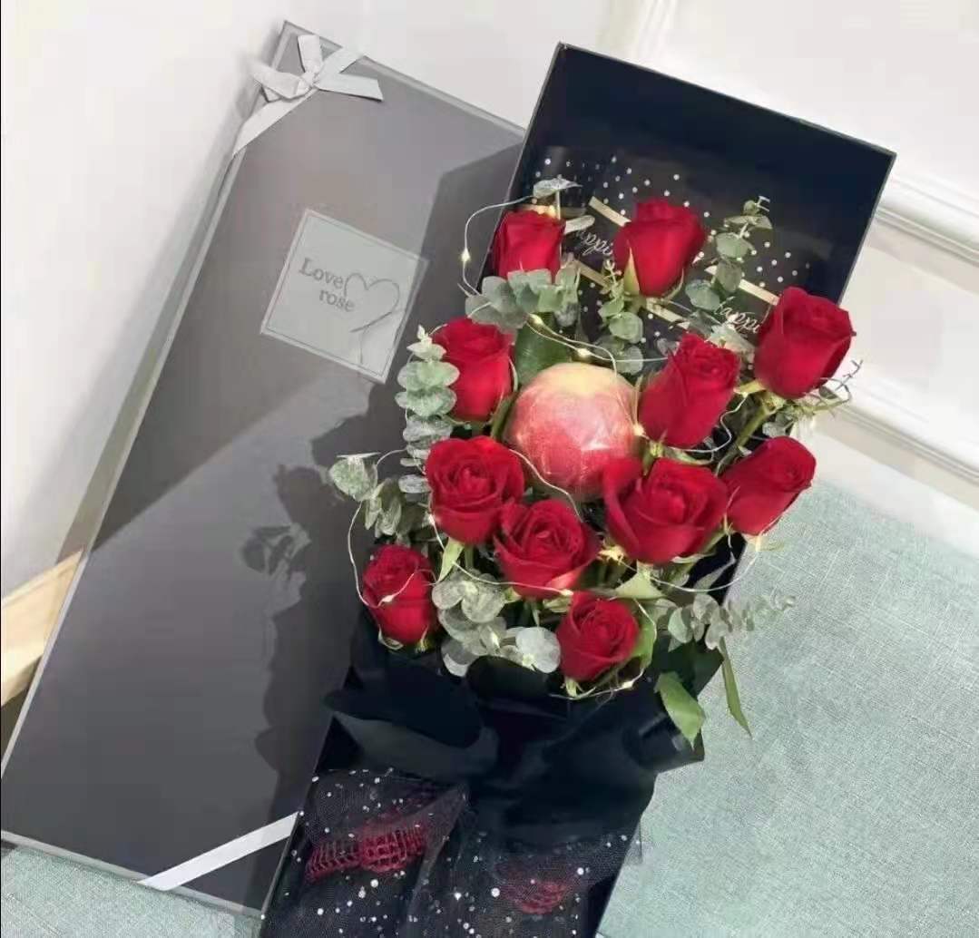材质: 11枝红玫瑰,1个苹果,彩灯,尤加利叶搭配