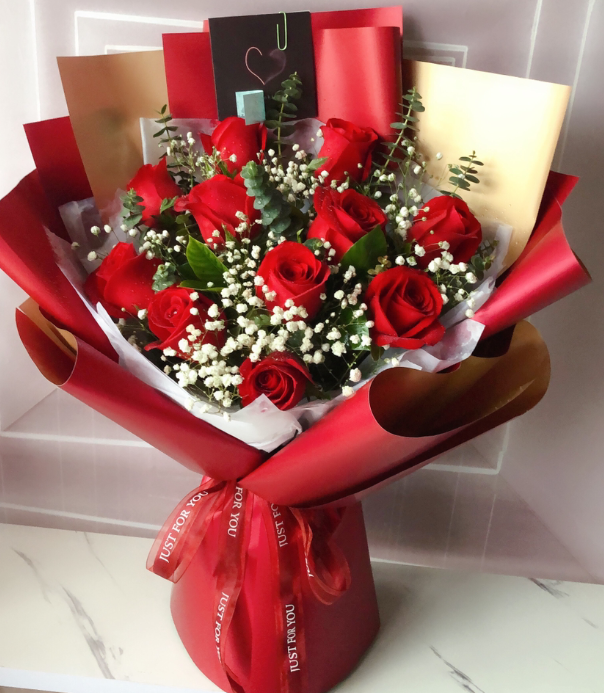 材质: 11枝红玫瑰,满天星、尤加利叶丰满