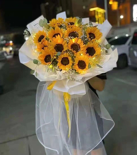 材质: 13枝向日葵,彩灯,白色满天星,尤加利叶搭配