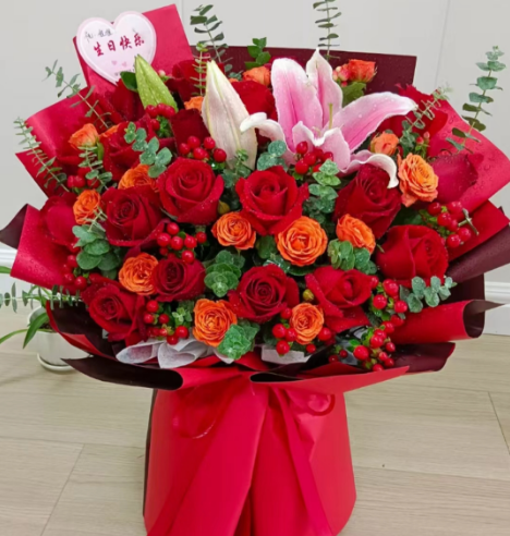 材质 19枝红玫瑰,2枝粉百合,5枝多头橙色泡泡,红豆,尤加利叶搭配