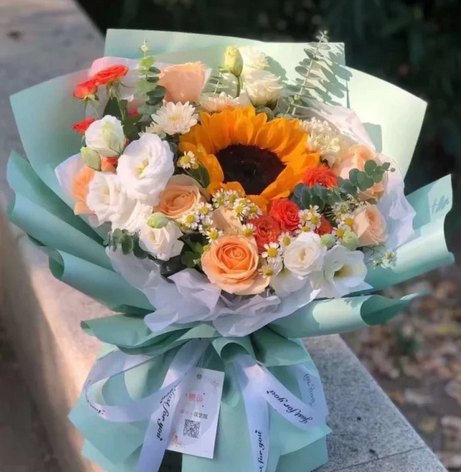 | 材质: | 1枝向日葵,6枝香槟玫瑰,白色洋桔梗,橙色泡泡,洋甘菊,尤加利叶丰满 | ||||