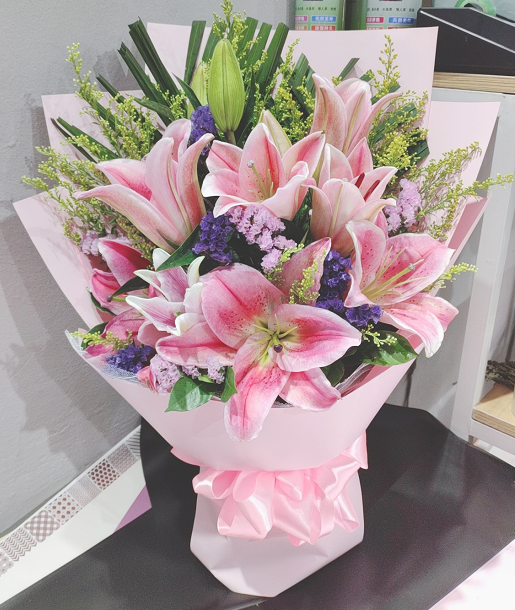 材质: 精选11朵粉百合,勿忘我,绿叶搭配