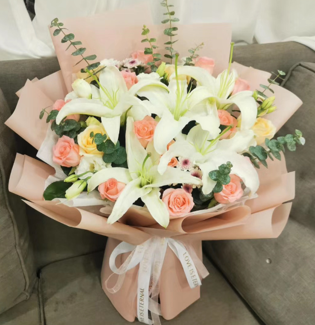 其它说明: 由于鲜花包扎各地的花艺师不同,可能在花束的形式和搭配上与图片不完全一致