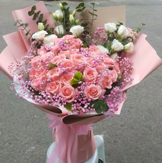 材质: 33枝戴安娜玫瑰,粉色满天星,栀子叶,洋桔梗,尤加利叶点缀搭配
