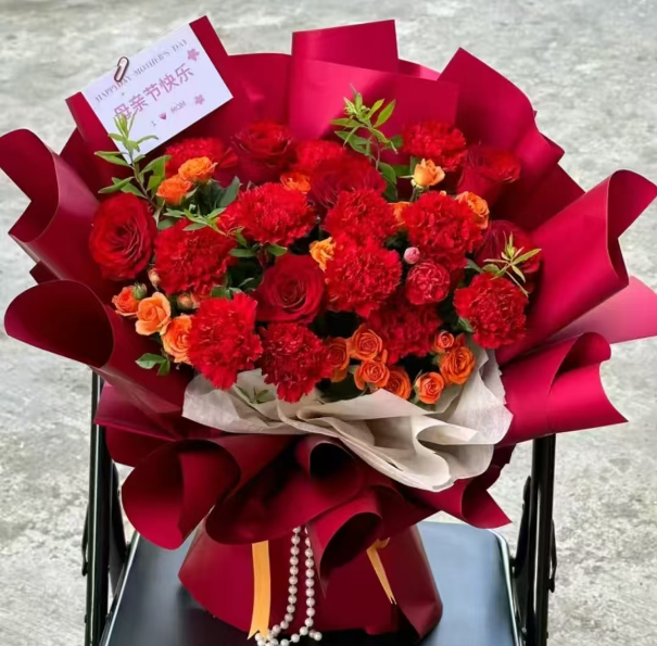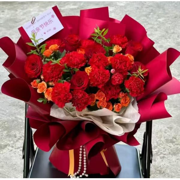 | 材质: | 1串珍珠 精选13枝红色康乃馨 6枝红玫瑰 5枝多头橙色泡泡,七星叶搭配 | ||||