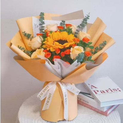 材质: 1枝向日葵,6朵香槟玫瑰,足量橙色泡泡搭配