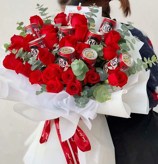 材质: 21枝红玫瑰,9瓶养乐多,尤加利叶搭配