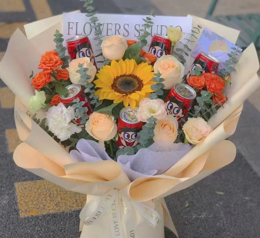 材质: 6罐旺仔牛奶(245ml/罐),香槟玫瑰,洋桔梗,橙色泡泡,尤加利叶搭配