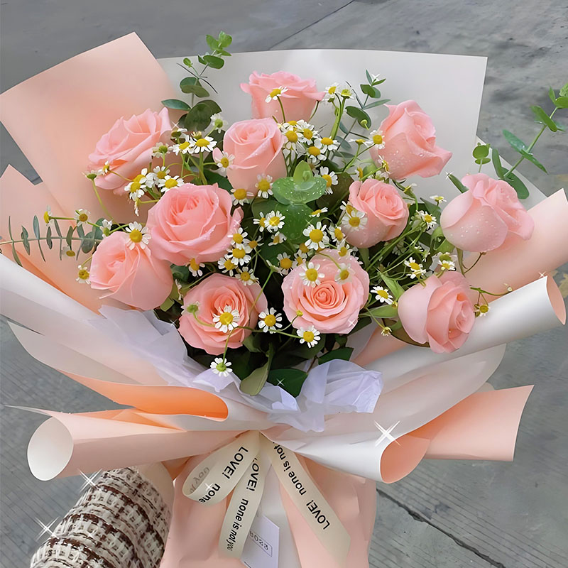 材质: 11枝戴安娜玫瑰,洋甘菊丰满,尤加利叶搭配