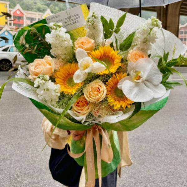 材质 精选8枝香槟,3枝向日葵,1枝蝴蝶兰,1枝郁金香,4枝白色紫罗兰,喷泉草,七星叶搭配