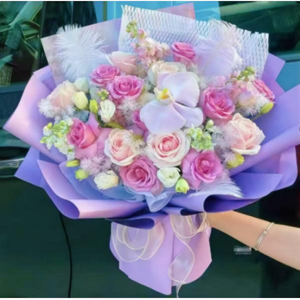 材质: 9枝紫玫瑰,10枝粉雪山玫瑰,4枝紫罗兰,