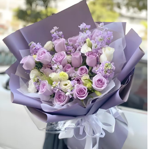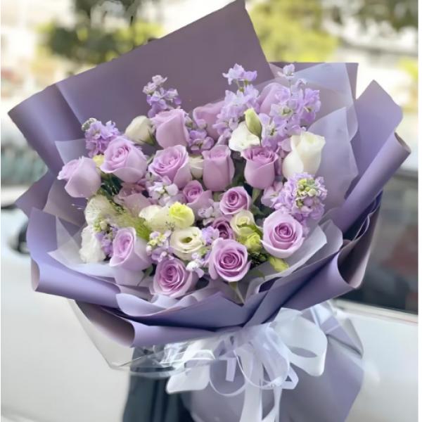 | 材质: | 16枝紫玫瑰,3枝白玫瑰,6枝浅紫色紫罗兰,桔梗,喷泉草搭配 |