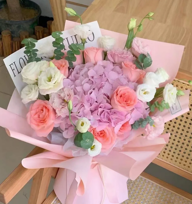 | 材质: | 9枝戴安娜,1枝浅紫色绣球花,洋桔梗,尤加利叶丰满 |