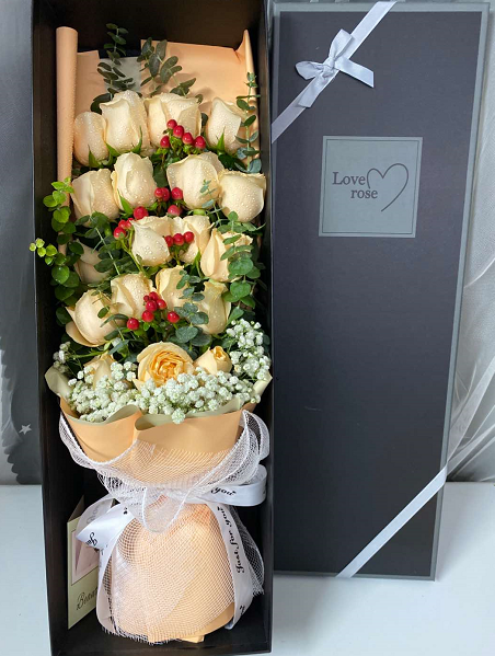 材质: 19枝香槟玫瑰,白色满天星,尤加利叶,红豆搭配