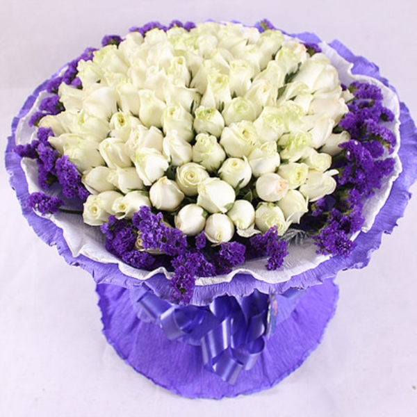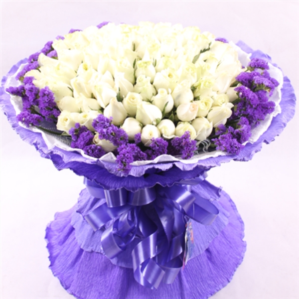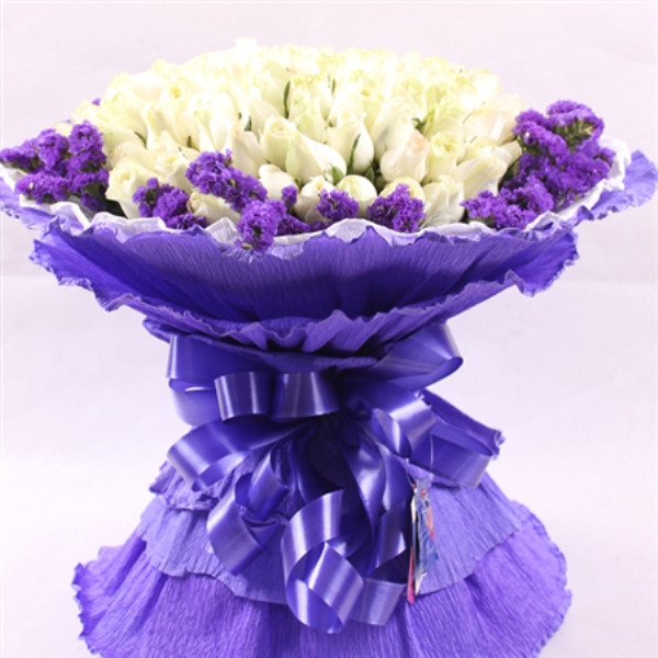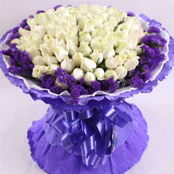 包装: 白色与紫色卷边纸圆形包装,蓝色彩带蝴蝶结束结