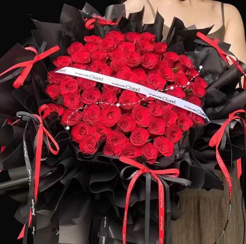 材质: 66枝红玫瑰,6个蝴蝶结丝带,1根珍珠串链,1条字母丝带搭配