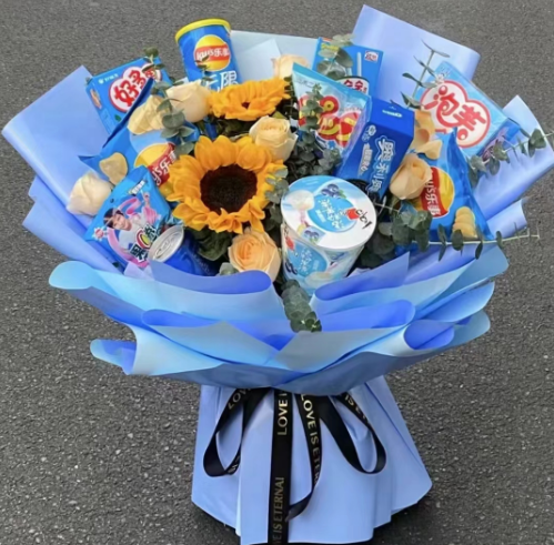 材质 向日葵 香槟玫瑰 零食 尤加利叶搭配