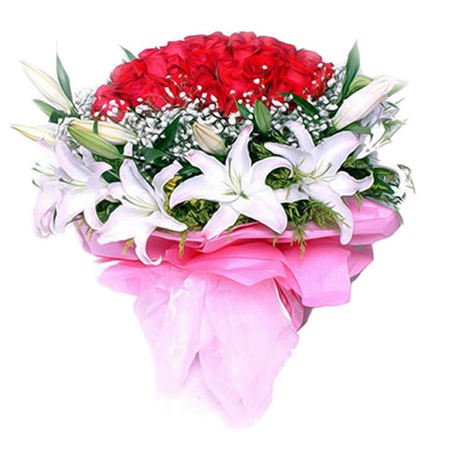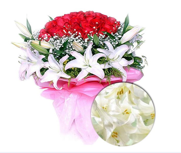 | 材质: | 红玫瑰66枝,满天星丰满,黄莺丰满围绕,10枝白色香水百合(多头) | ||||