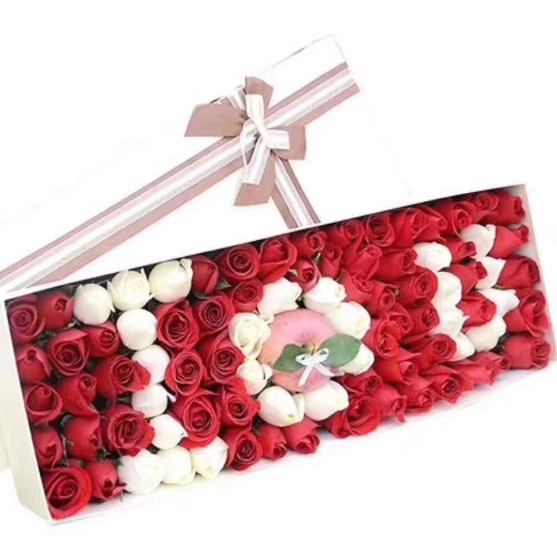 材质: 73朵红玫瑰,26朵白玫瑰,共99朵玫瑰如图样式 1个苹果高端礼盒装