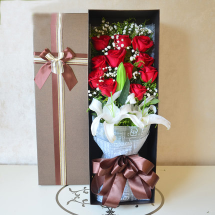 | 材质: | 11枝玫瑰加3朵百合 黄英满天星搭配 | ||||
