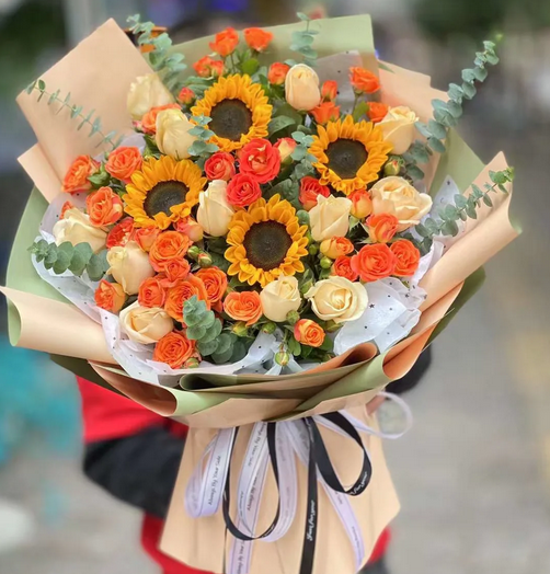 材质: 11枝香槟玫瑰,4枝向日葵,5枝多头橙色玫瑰,尤加利叶丰满