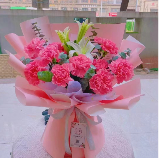 材质: 精选11枝粉色康乃馨 3朵粉色百合 尤加利叶搭配