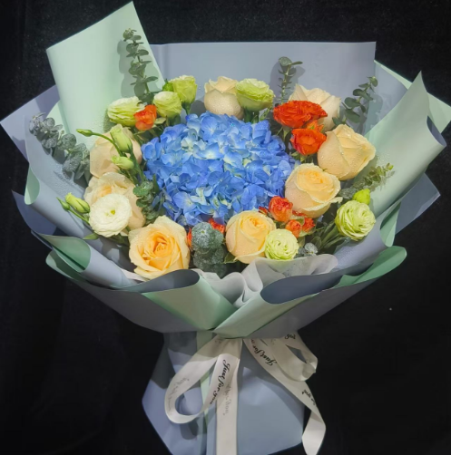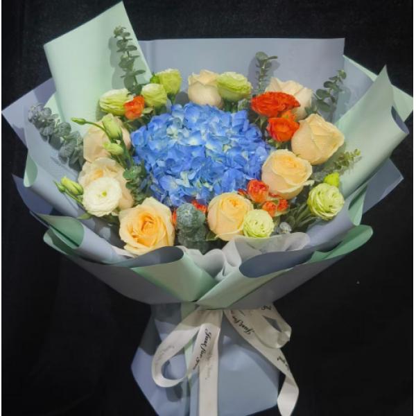 | 材质: | 精选香槟玫瑰9朵,1朵蓝色绣球,桔梗,橙色泡泡,尤加利叶搭配 | ||||