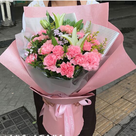 | 材质: | 粉色康乃馨21朵,4朵百合 相思梅 桔梗 黄英搭配 |
