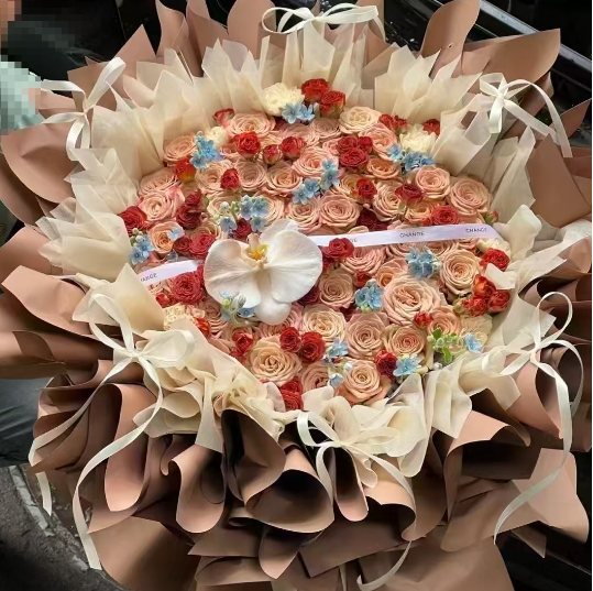 | 材质: | 精选99枝卡布奇诺玫瑰,1枝蝴蝶兰,蓝星花,巧克力泡泡如图搭配,蝴蝶结装饰 | ||||