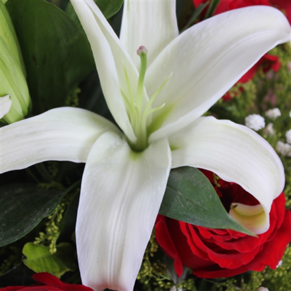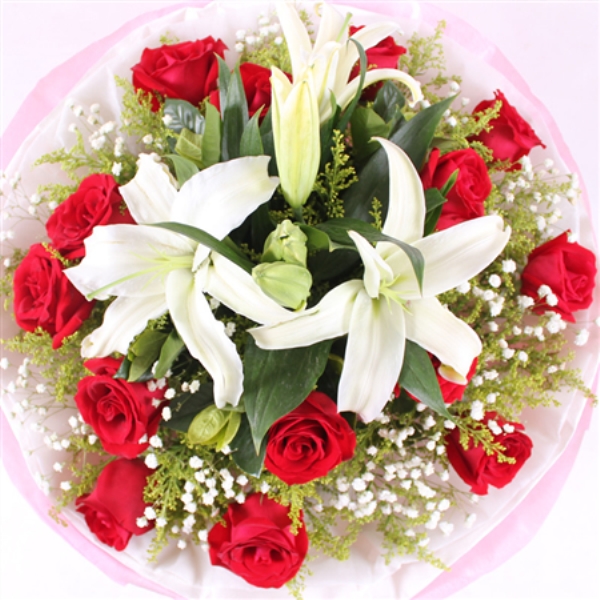 | 材质: | 精心挑选19朵昆明红玫瑰,6朵白色香水百合。点缀黄莺、满天星,美丽迷人。 | ||||