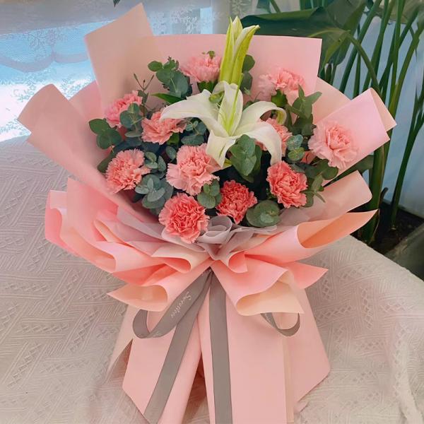 材质: 1枝百合,11枝粉色康乃馨,尤加利叶搭配