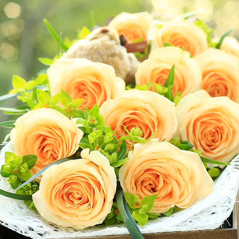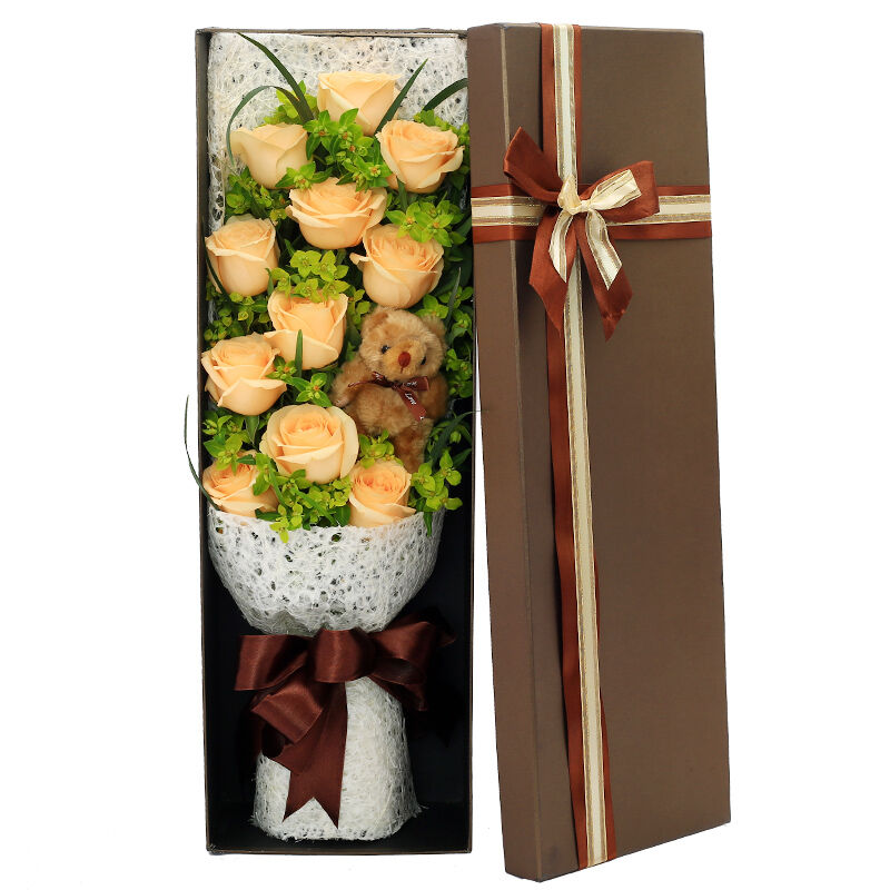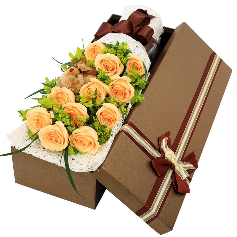 | 材质: | 11枝香槟玫瑰,一只小熊 叶上黄金 绿叶 搭配 | ||||