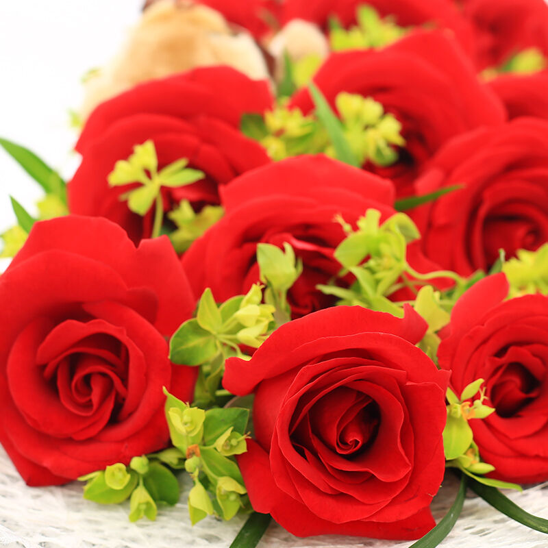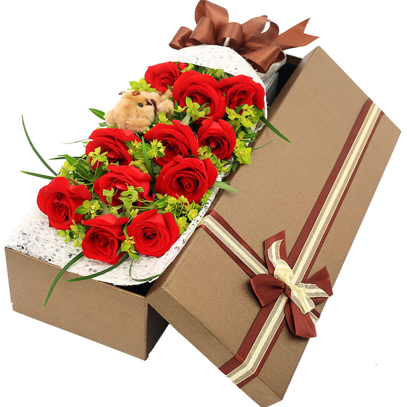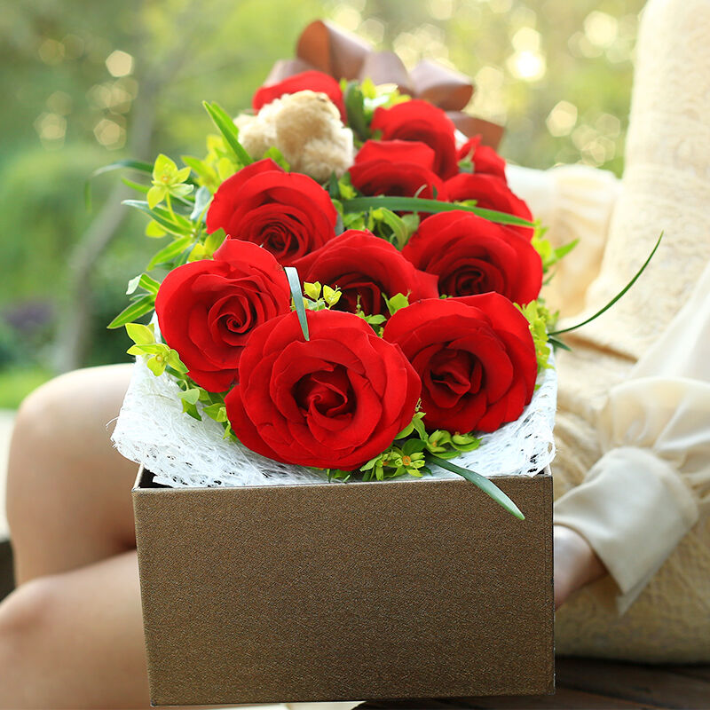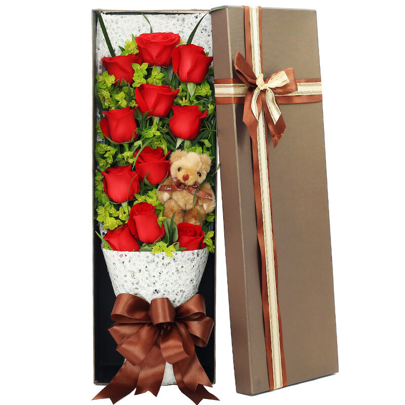 | 材质: | 11枝红玫瑰,一只小熊 叶上黄金 绿叶点缀 | ||||
