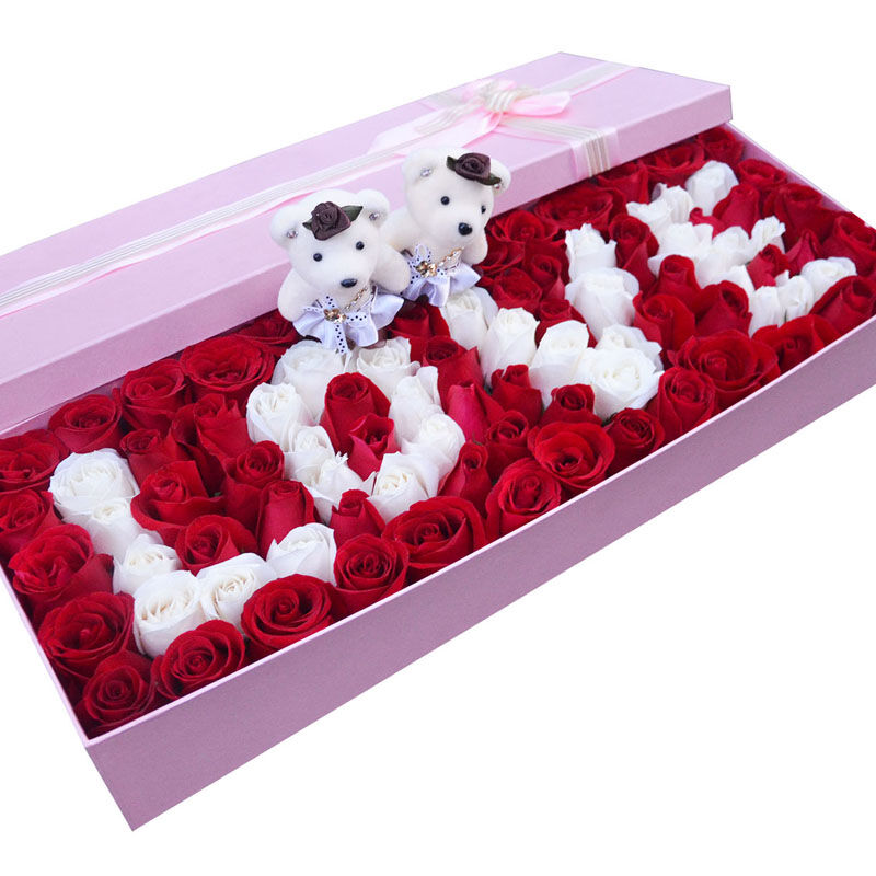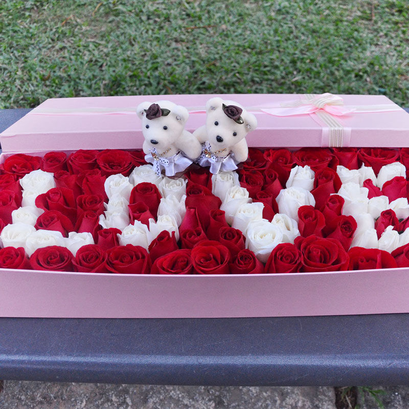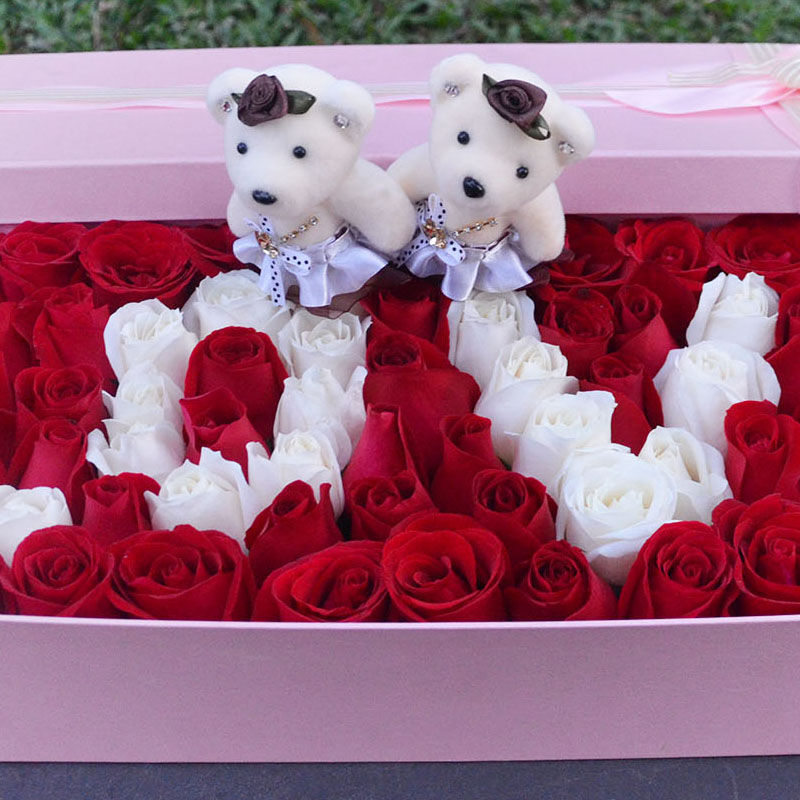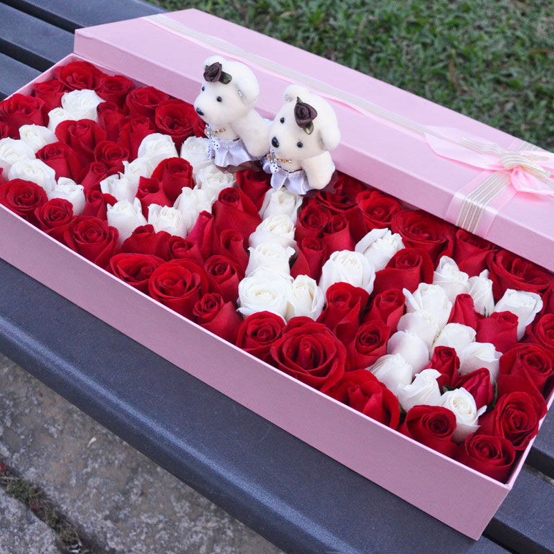 | 材质: | 67朵红玫瑰32朵白玫瑰 共99朵按图制作 小熊2只 | ||||