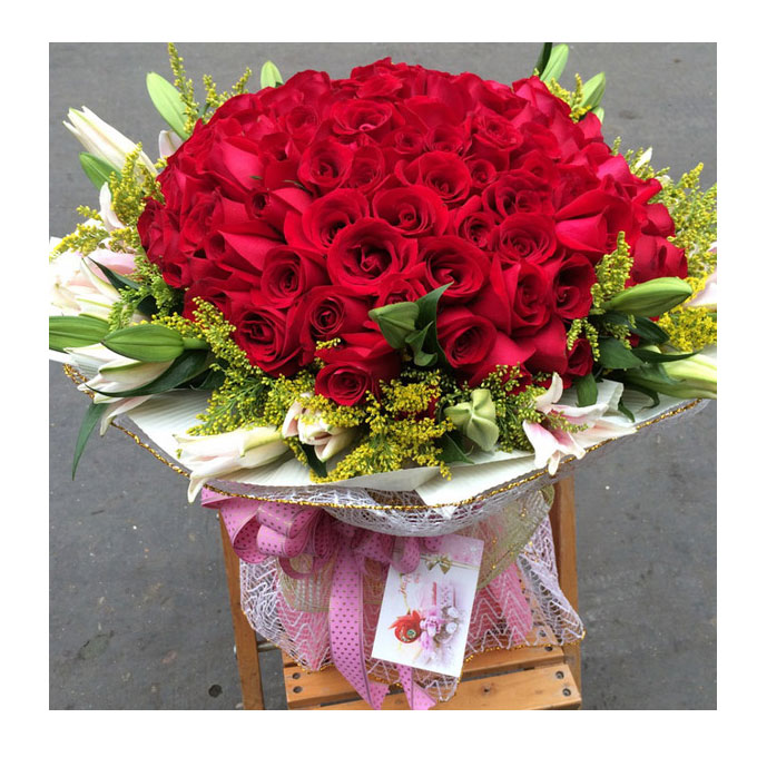 材质: 99朵昆明精品红玫瑰+10枝三头粉百合,黄莺围边;