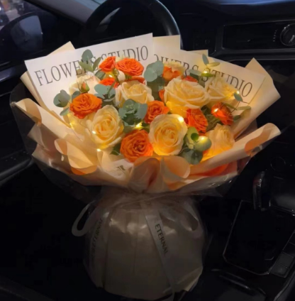材质: 11枝香槟玫瑰,多头橙色泡泡,彩灯,尤加利叶搭配