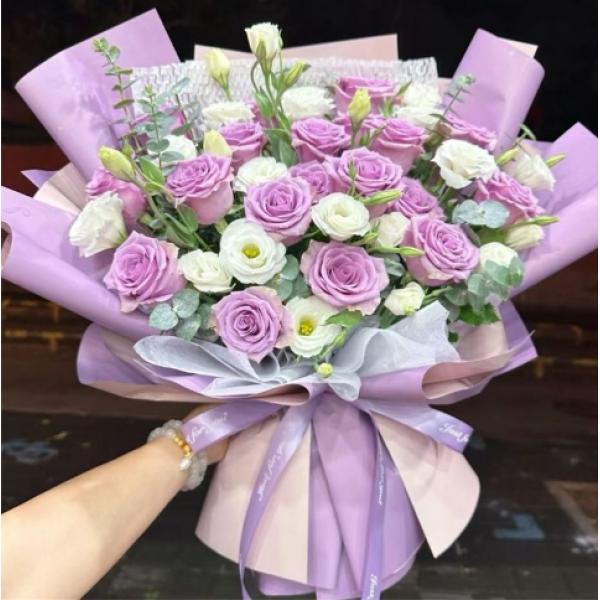 材质: 19枝紫玫瑰,足量桔梗,尤加利叶搭配