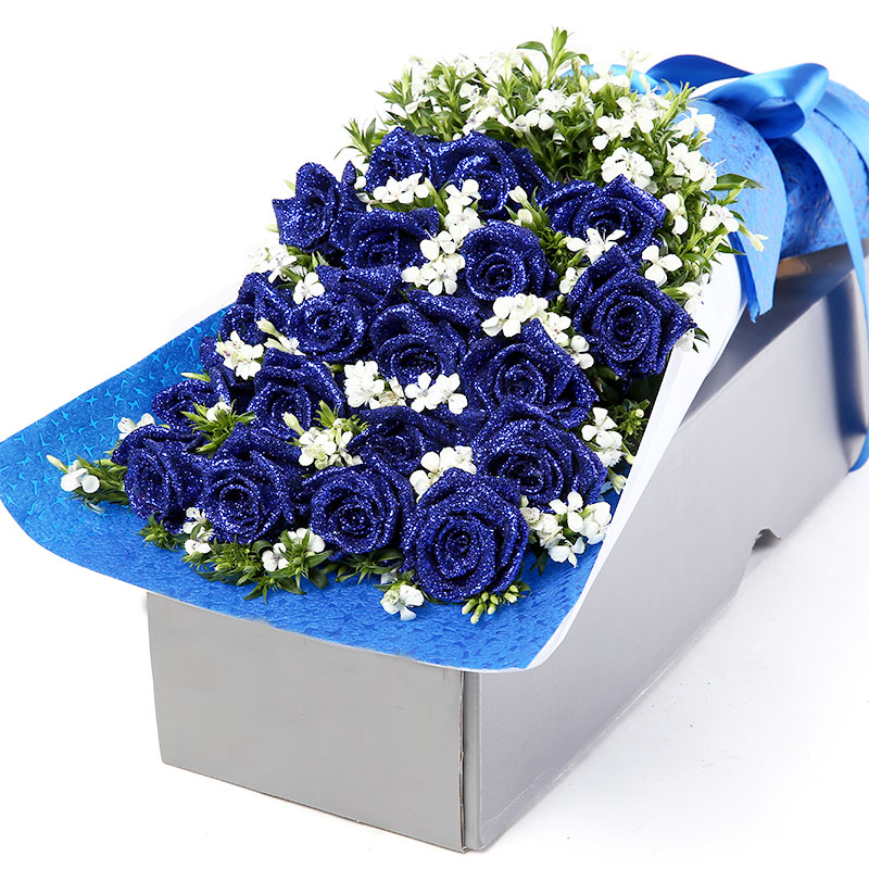 包装: 白色、蓝色镂空纸包装,蓝色丝带扎束,盒装(以花店配送为准)