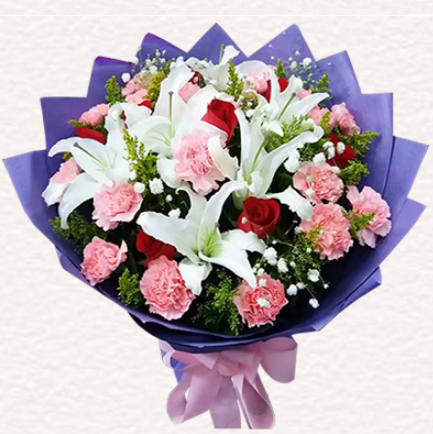 | 材质: | 19枝粉色康乃馨,11朵红玫瑰,8朵百合 黄英满天星搭配 | ||||
