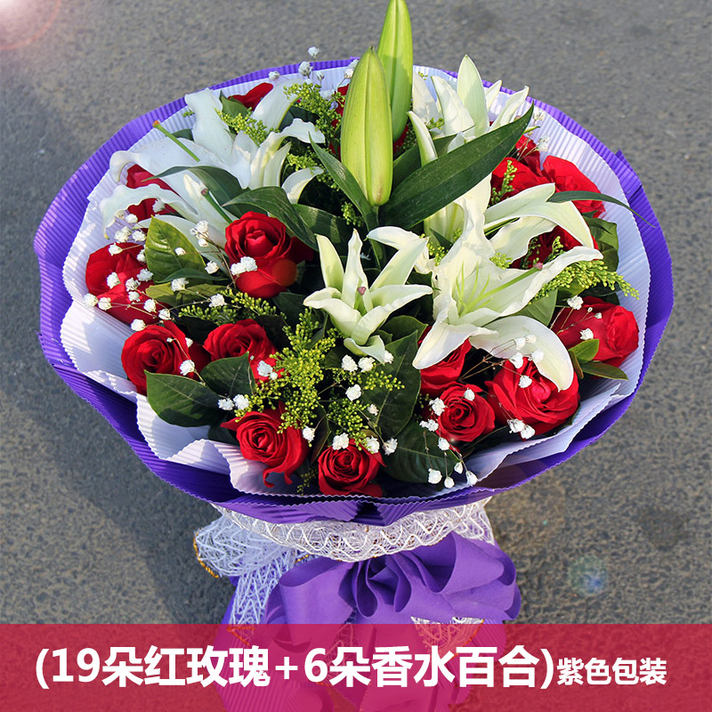 材质: 精选19朵红玫瑰 6朵百合黄英满天星栀子叶点缀