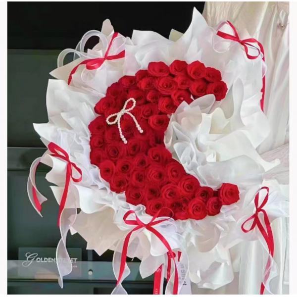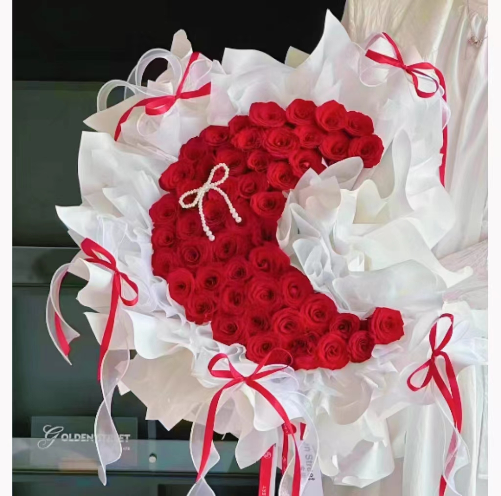 | 材质: | 52枝红玫瑰如图制作 一串珍珠,5个红色加粉色丝带 | ||||