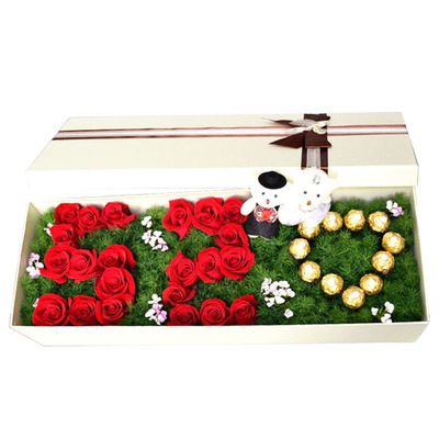 材质 精选22朵红玫瑰 11颗巧克力摆成心形 绿叶铺垫,相思梅点缀 小熊两只