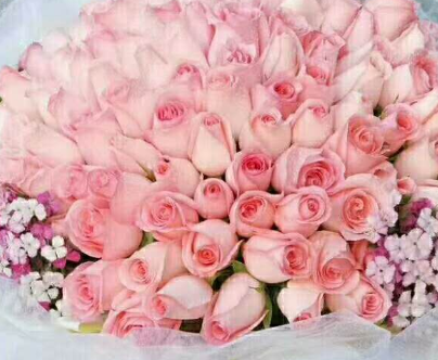 材质: 99朵粉玫瑰,相思梅点缀,白纱包装
