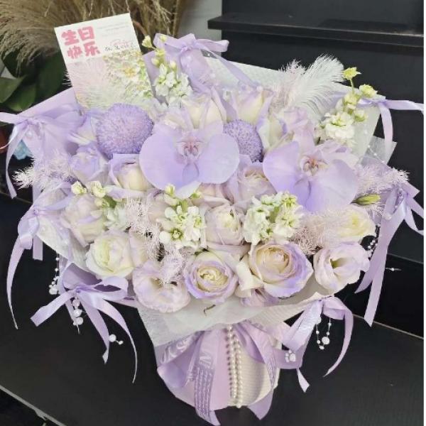 | 材质 | 19枝白玫瑰喷浅紫,2枝蝴蝶兰喷紫,2片羽毛,5枝白色紫罗兰,2枝乒乓球菊喷紫,桔梗丰满,蓬莱松搭配,8个丝带珍珠结如图制作 |