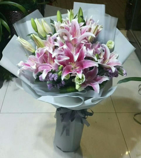 材质: 挑选50朵粉色百合 桔梗、勿忘我搭配