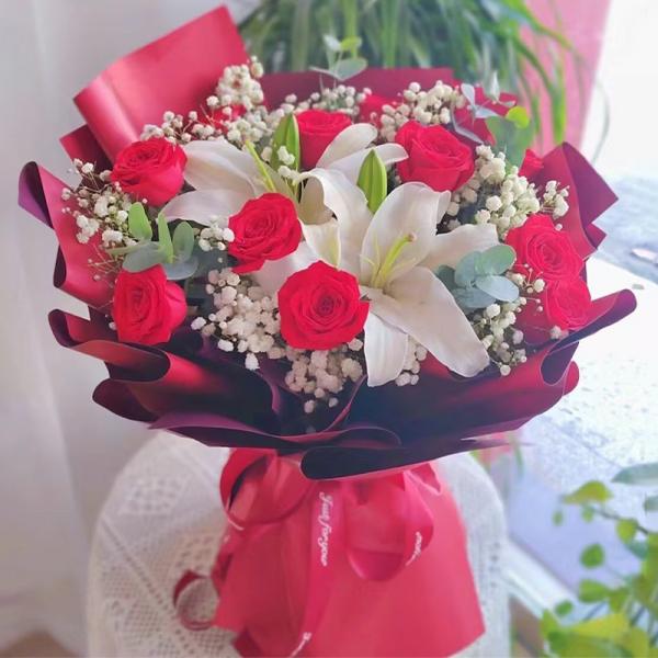 | 材质: | 11枝红玫瑰,2枝多头百合,满天星丰满,尤加利叶搭配 | ||||