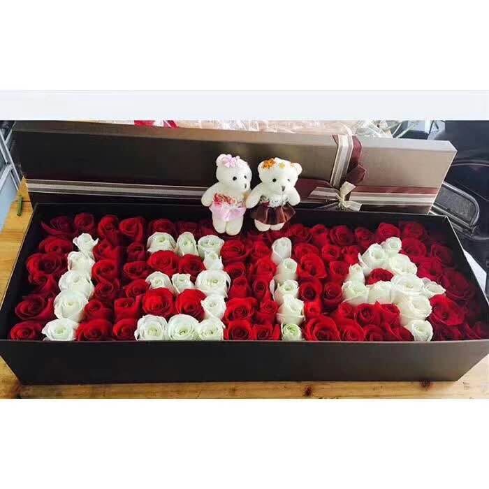 材质: 精选68朵红玫瑰,31朵白玫瑰拼凑数字“1314”,共99朵,加2只小熊。