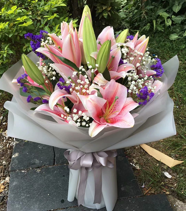 材质: 21朵粉百合,勿忘我,满天星搭配