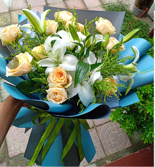 材质: 精选11枝香槟玫瑰 搭配10朵百合,黄英搭配