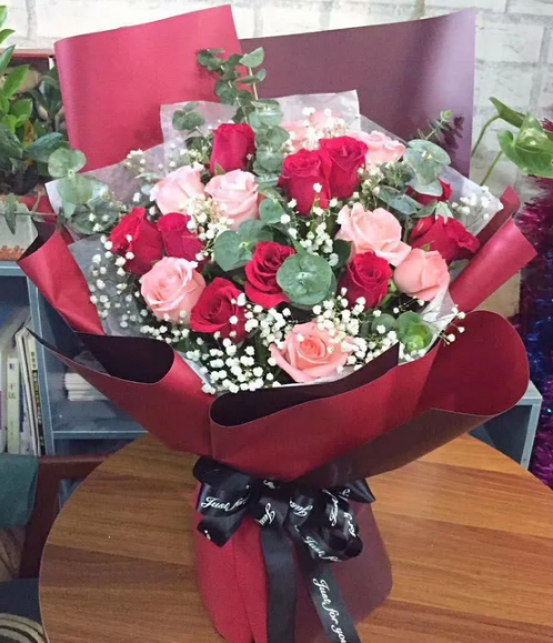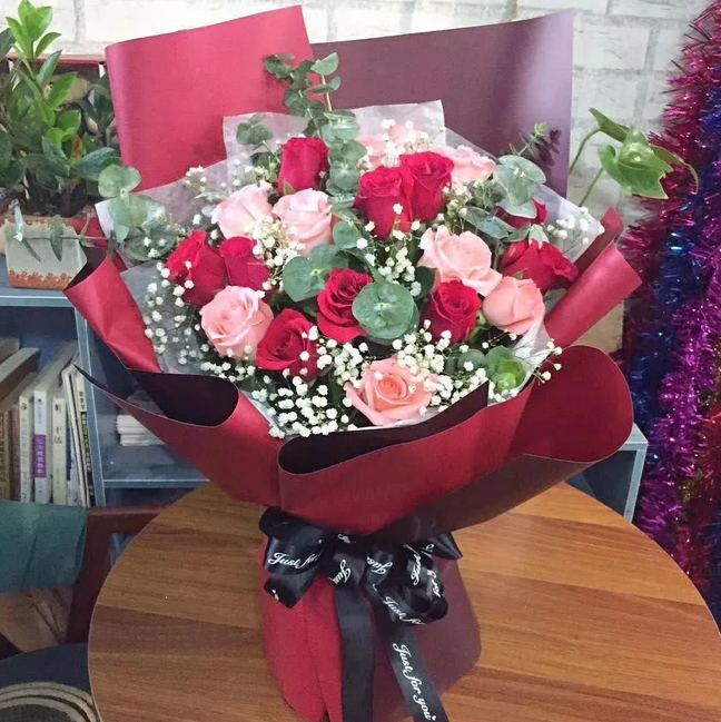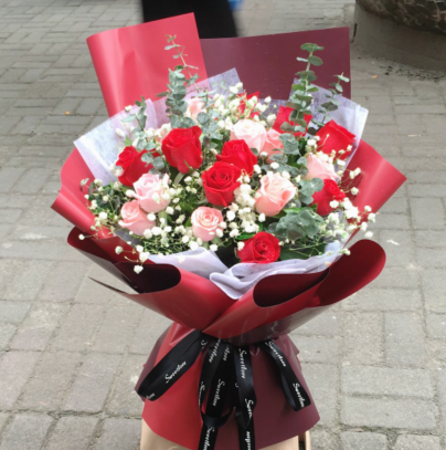 材质: 9朵戴安娜玫瑰,10朵红色玫瑰,满天星、尤加利叶间插点缀